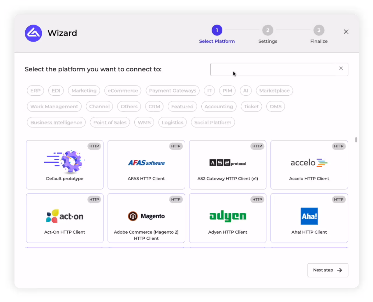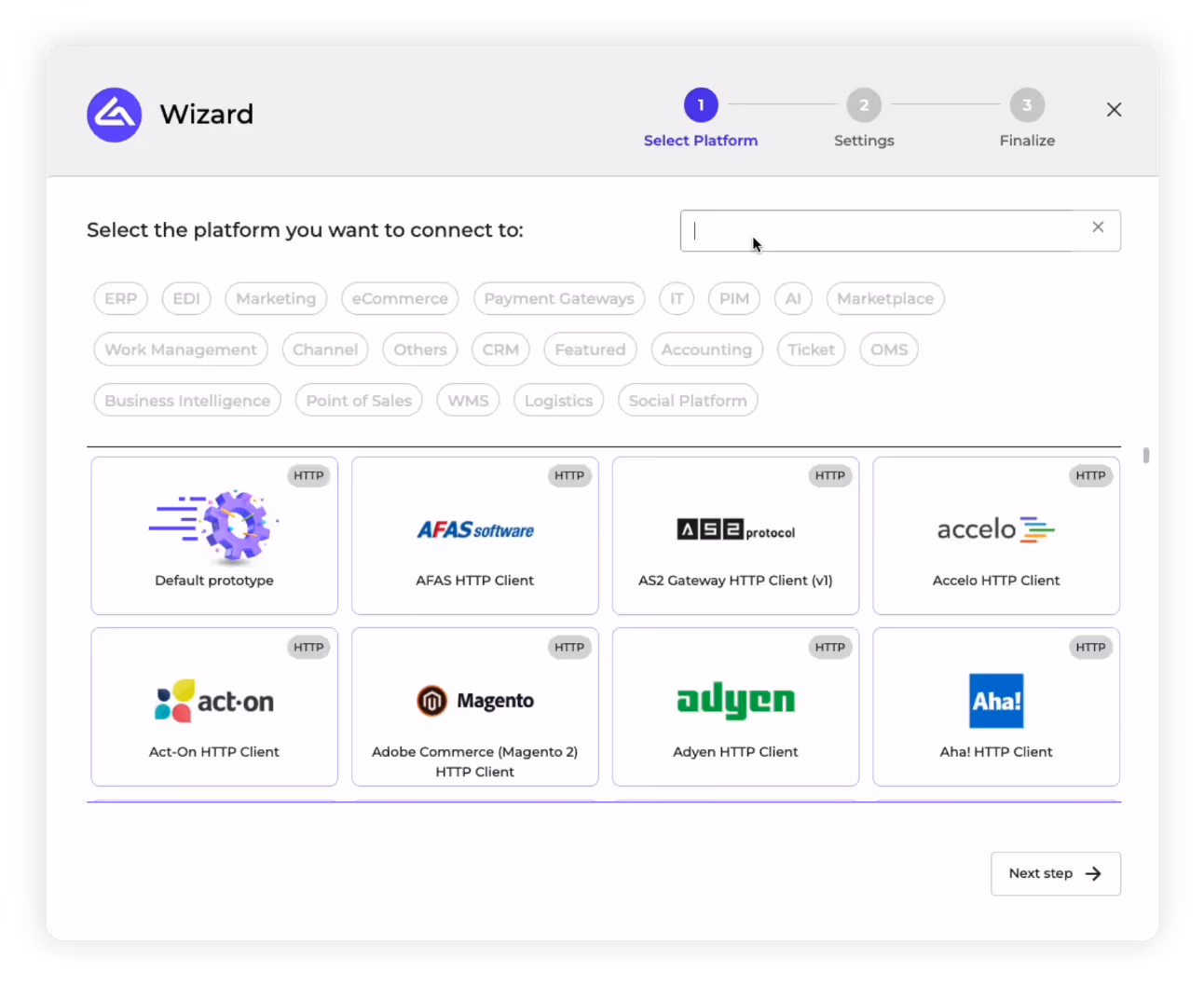 2. Connectors: This will open our HTTP client connection wizard, which we can use to search for the Connector of the second application you wish to integrate via Alumio.