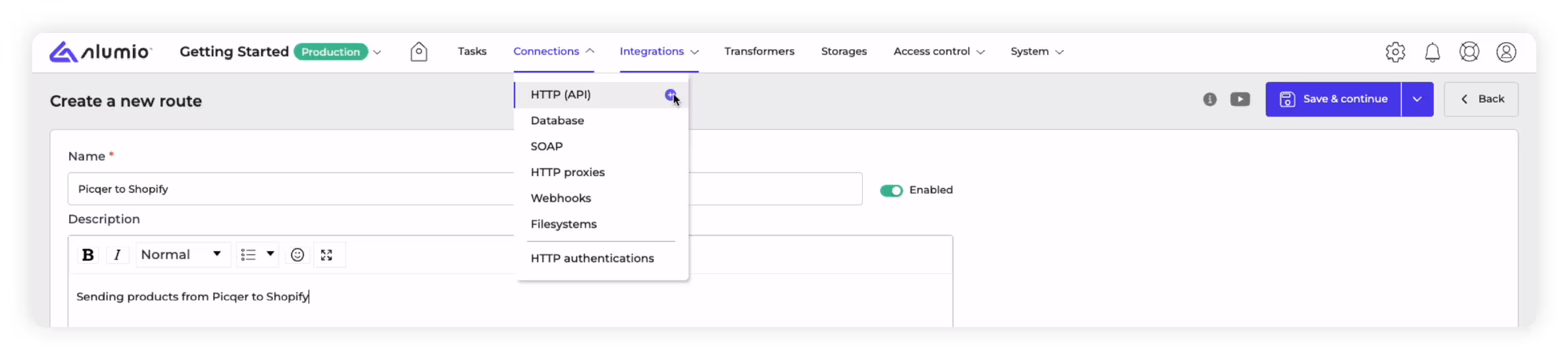 To simplify our walkthrough of helping you build your first integration, we’ll use an example integration. We will show you how to deploy an integration between Picqer, a warehouse software for online stores, and the popular e-commerce platform Shopify. As part of the walkthrough, we’ll show you how the Alumio iPaaS can be used to swiftly integrate product data from Picqer to Shopify, in order to demonstrate how to build your first integration.