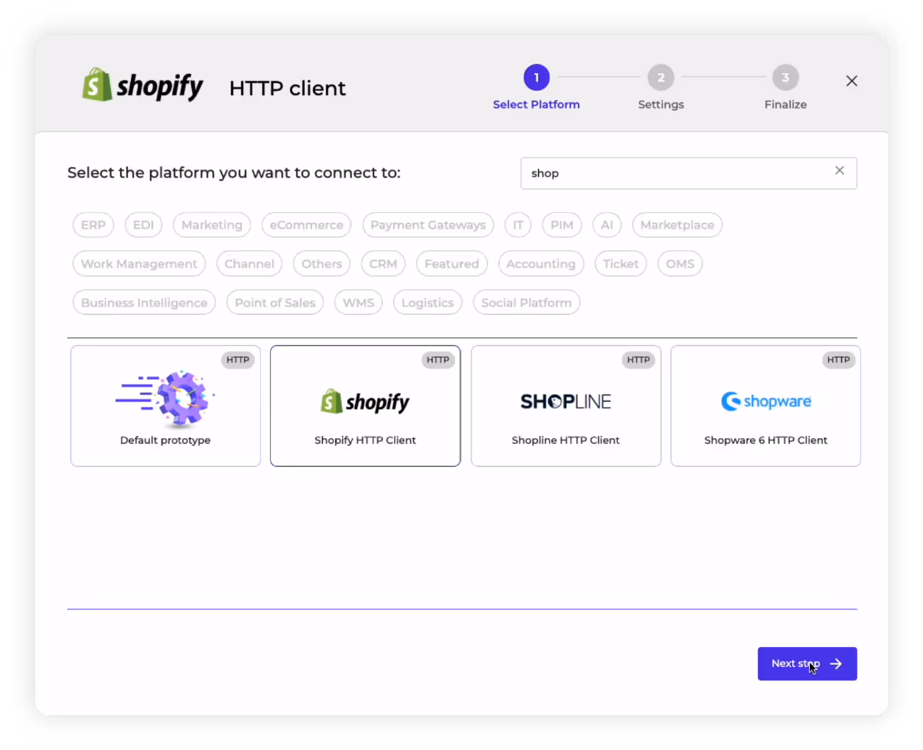 3. Choose Connector: Search for the application you wish to integrate with the HTTP wizard. As per our example, we simply search for Shopify and select it to start configuring our HTTP client.