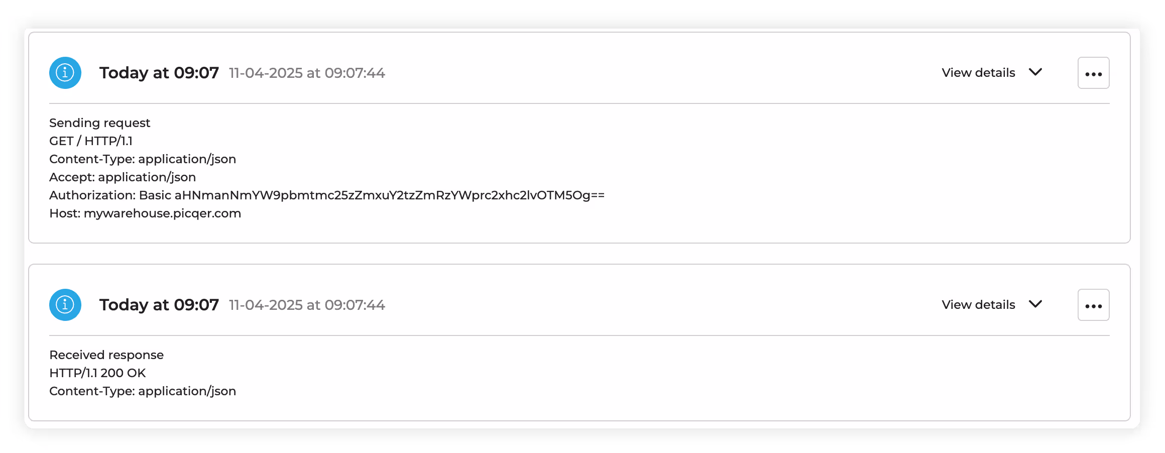 3. If the connection works, we will receive a success indicator or 200 OK responses when clicking on the “view logs.” This means that our connection is set, and now Alumio can talk directly with our Picqer application and account. If you received a failed response, you need to check your API key and your URI.