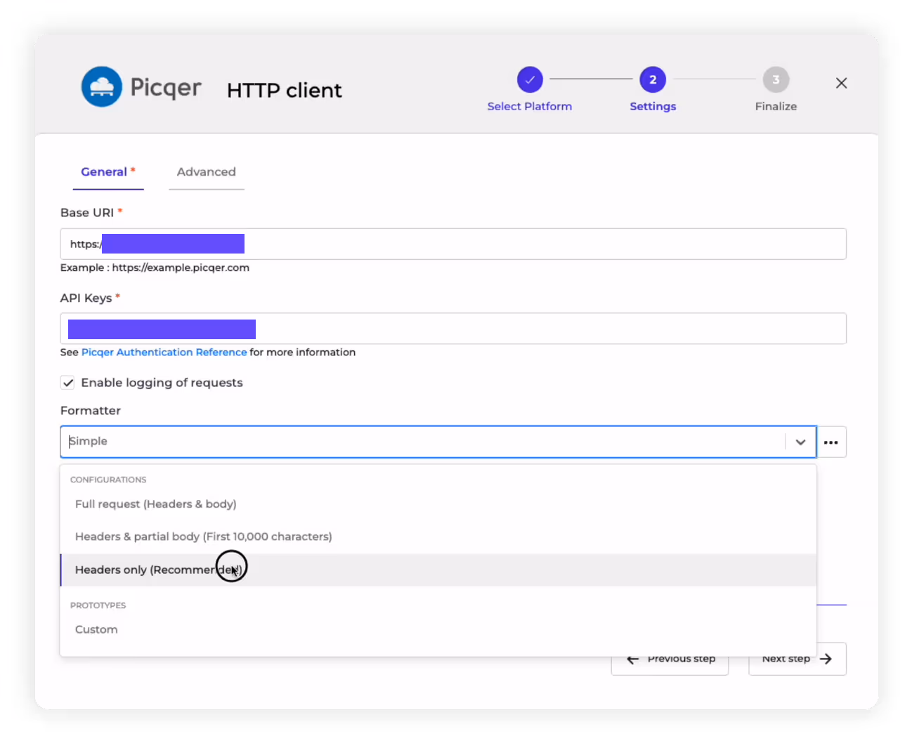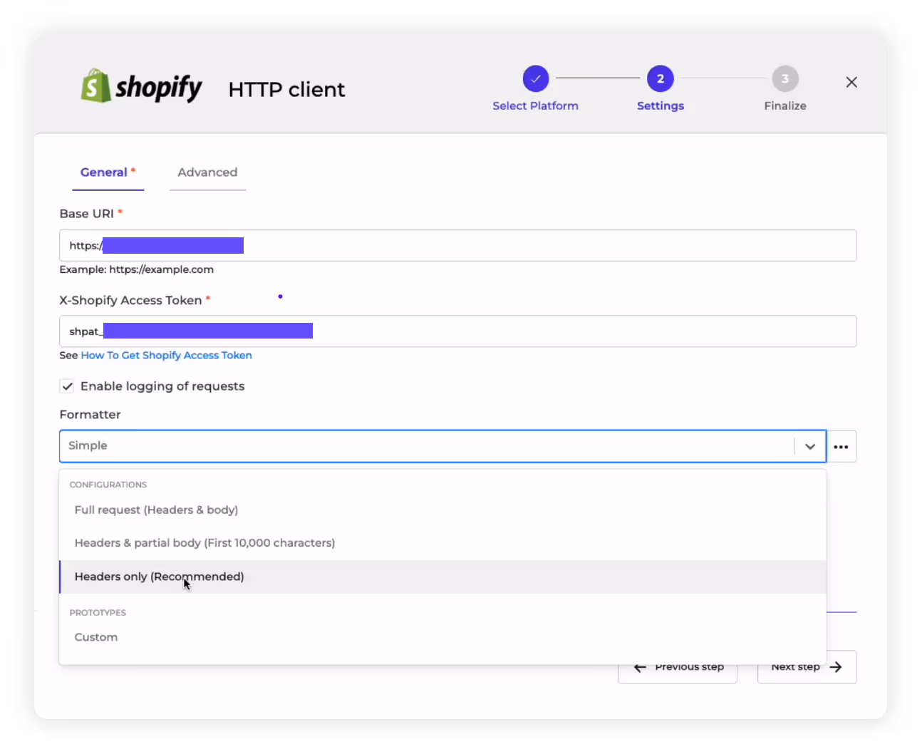 5. Enable logging: You can also choose to enable the “logging of requests” and then select a logging format, based on how detailed you want it to be. In this case, as you can see, we recommend the “Headers only” logging option.