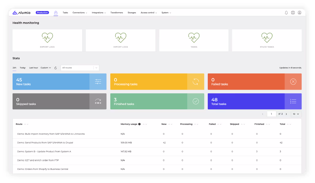 One of the most exciting Alumio features of 2024 was enabling our users with the ability to process Routes in parallel with Alumio Data Engines. The more Data Engines an Alumio integration environment equips, the more integration Routes it can run in parallel through our advanced queuing mechanism. This offers a great performance advantage to customers that need to manage a mix of real-time integrations that run constantly between applications, along with high-volume data integrations that occur in batches at scheduled intervals. The base Alumio plan now offers two Data Engines, allowing users to run at least two Routes in parallel through the integration queue. However, users can also add-on as many Data Engines to their plan as required, to scale up their integrations while ensuring peak performance.