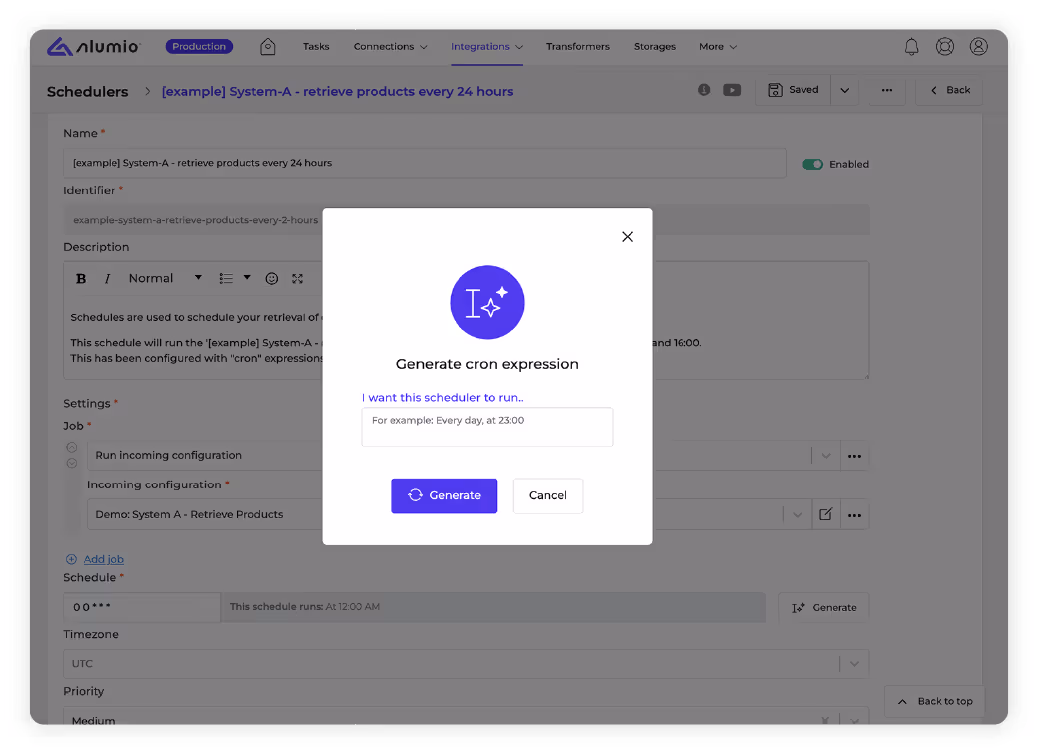 The Alumio Scheduler is one of the key features in setting up your integrations in Alumio, ensuring you schedule your integrations in a way that maximizes time and process efficiency. In that spirit, we added an AI Scheduler Generator that allows you to swiftly generate “Cron expressions” by typing a natural language request. This innovation simplifies task automation and makes it easy for users of all technical levels to schedule integrations.
