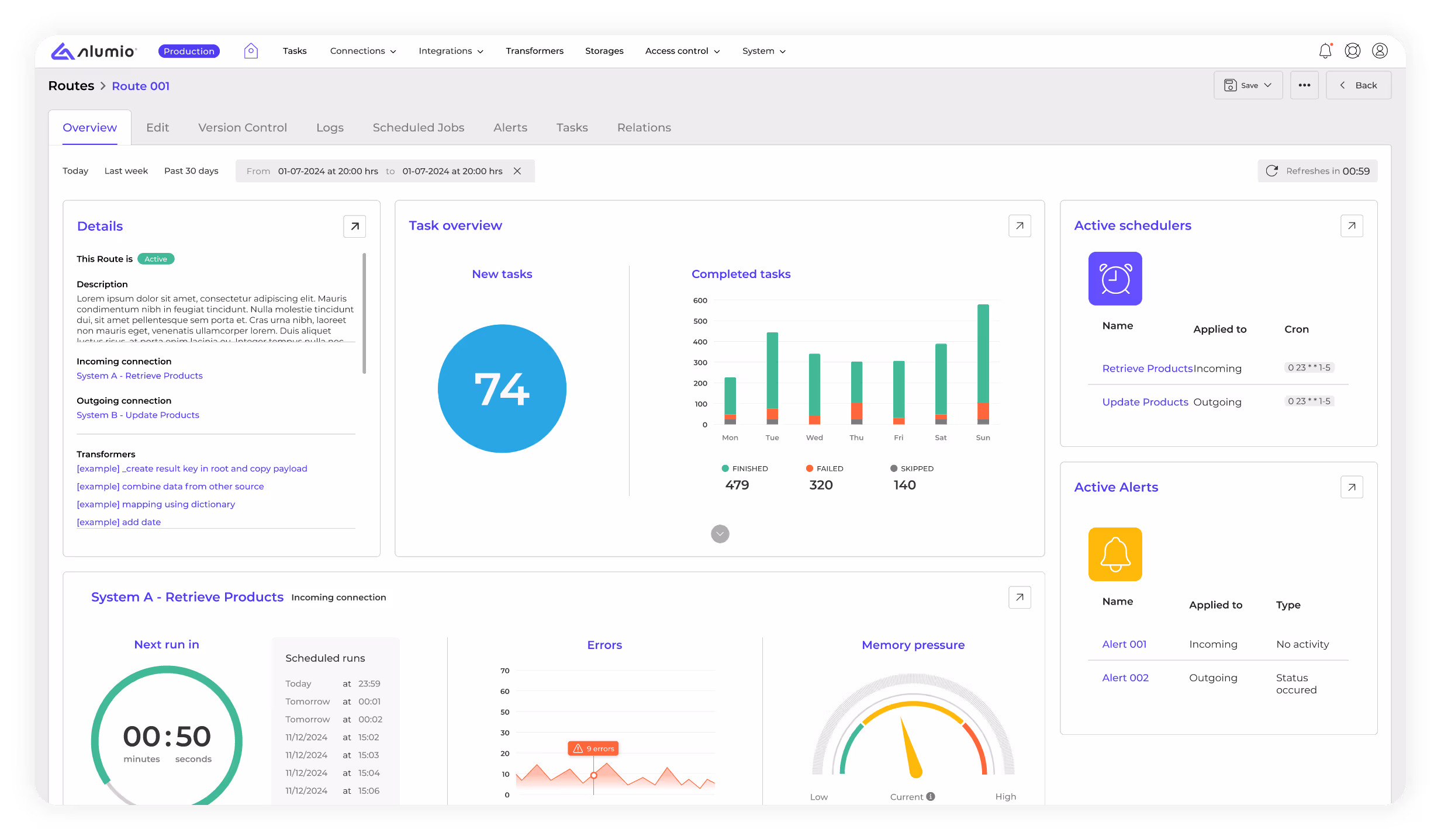 We’re excited to introduce our newly designed Route Overview, which will give you detailed insight into the health, performance, and status of each Route within Alumio. The new design clearly displays key metrics of a Route, when it is scheduled to run next, the Transformers applied, the Tasks generated, a historical overview of the errors, and real-time memory usage. You can now identify and resolve issues faster, track error logs effectively, monitor connection status in real time, address disruptions before they impact your workflows, and optimize your Routes for greater efficiency.
