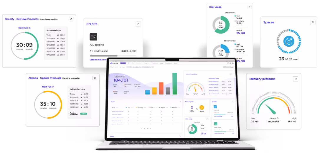 Alumio is built as a high-performance integration platform to help external applications to be connected, and to handle big data. Data is transformed into smaller packages called ‘Alumio tasks’ and can flow through our system in a scalable manner into externally connected applications via our API, supported by our robust queuing mechanism.